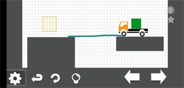 从第二关起,我们需要在界面上绘制一些辅助线,以便帮助我们抵达虚线框所在的位置。只要按照图中的线段绘制完成,再将卡车向左移动到下图所示的位置,就能顺利通关了。