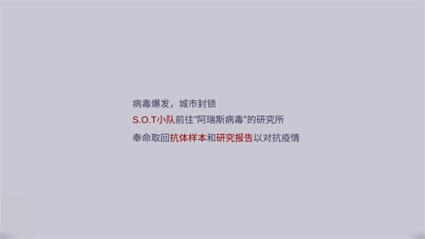 4、这里会交代游戏剧情,病毒爆友,城市封锁S.O.T小队前往“阿瑞斯病毒\\"的研究所奉命取回抗体样本和研究报告以对抗疫情;