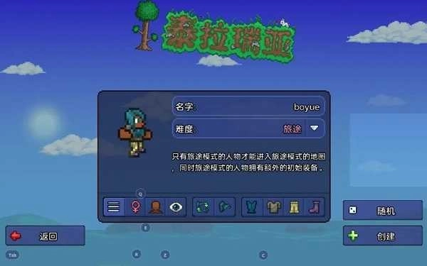 旅途:最简单的一种,初始会有铁质装备、法杖、火把(这个如果开局就掉地下或者夜晚还是很有用的)、一对翅膀和一只可以攻击敌人的宠物鸟;不过旅途难度的角色只能进旅途难度的地图。