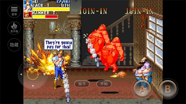 3、中间的难点是4个大个子两个两个轮流出现,其实注意要站到屏幕中间,那里是他们常常落角的地方,而且不要太过于移动,更不要站在屏幕边上堵。注意要时常3拳后扔出,不要一口气揍到底。可以轻松过去。