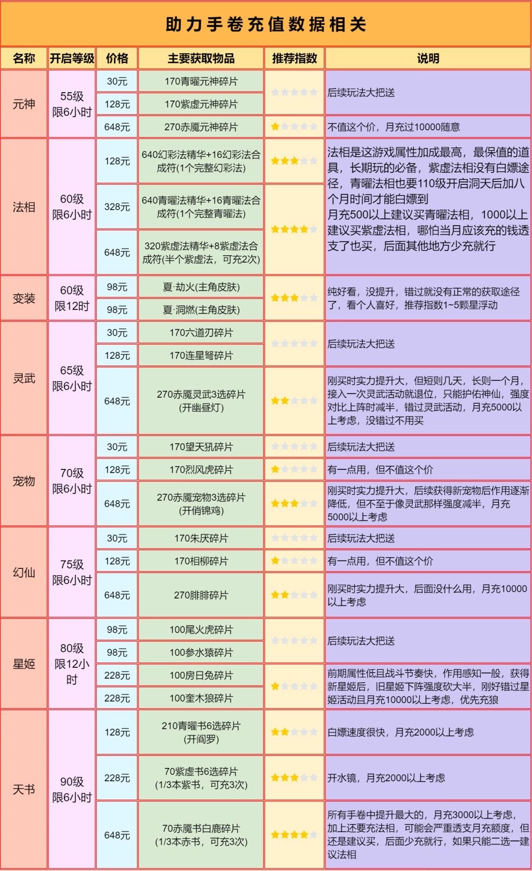 6月最新补充,7~8月会更新法相手卷,预算有限的可以不充紫虚法相,另外天书助力手卷推荐指数减1颗星,月氪5000以上推荐