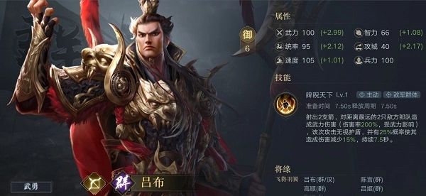 橙将汉吕布:御值5御,对目标发动一次攻击,武力值高于目标造成双倍伤害,并获得伤害加成,可叠加3次,持续到战斗结束。间隔7.5秒。