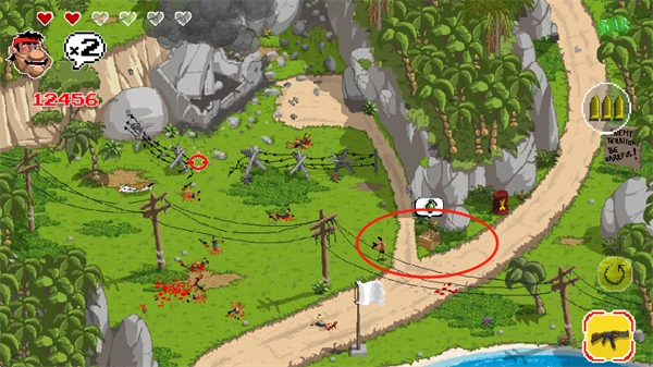 2、玩家被海浪冲上沙滩后,可通过点击屏幕右侧的“枪械”图标进行开火,点击“圆形按钮”实现翻滚动作;此外,长按屏幕还能达成“瞄准位置即射击位置”的精准打击效果,角色的血条与剩余命数均显示在屏幕左上角。