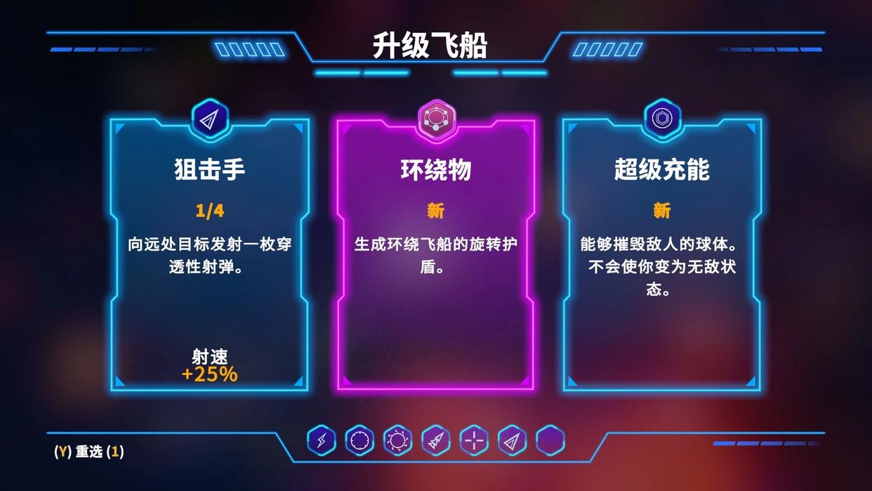 在游戏里,玩家击败敌人后会掉落经验值与金币,只要操控飞船移动到附近就能自动拾取。金币是可以带出本局游戏的,不管玩家最终有没有坚持到胜利,这些金币都能留存下来,用来解锁新飞船,或是在商店中解锁各类升级项目。而经验值则是玩家在当前对局内提升等级的关键,每次升级都会出现三选一的选项,玩家可以从中获得增益效果或者新武器。游戏里的武器不仅攻击方式多样,类型也十分丰富,不过武器之间的联动性似乎比较弱,很难组合出强力的玩法流派。