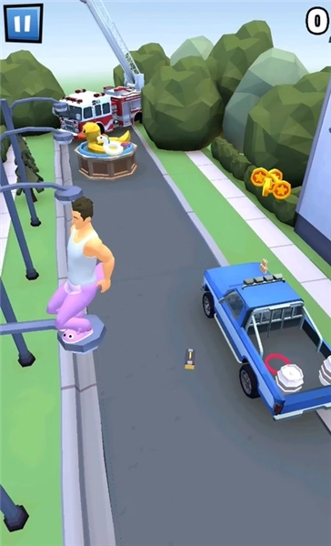 4、趣味化失败反馈机制:和传统游戏里“Game Over”那种生硬冰冷的提示不同,这里的失败处理方式自带幽默感。一旦操作出现失误,就会触发定制的搞笑动画场景——比如角色脚下打滑没站稳,可能直接整个人贴在路边广告牌上,四肢像被粘住的贴纸似的来回晃悠;要是不小心掉进水里,还会引来一群突然跃起的虚拟小鱼“围观”,再配上夸张逗趣的音效,原本可能带来挫败感的失败瞬间,反而变成了让人忍俊不禁的笑点。