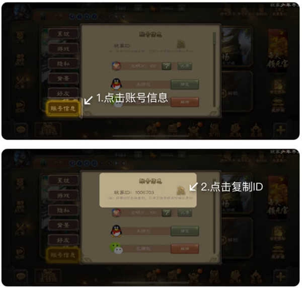 2、进入账号信息页面,复制自己的ID,接着在三国咸话里完成填写操作。