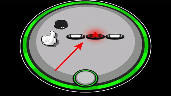 2、操控黑色小角色在绿色圆环上跳跃前进,跟随圆环的亮灭时机操作,确保角色持续移动。