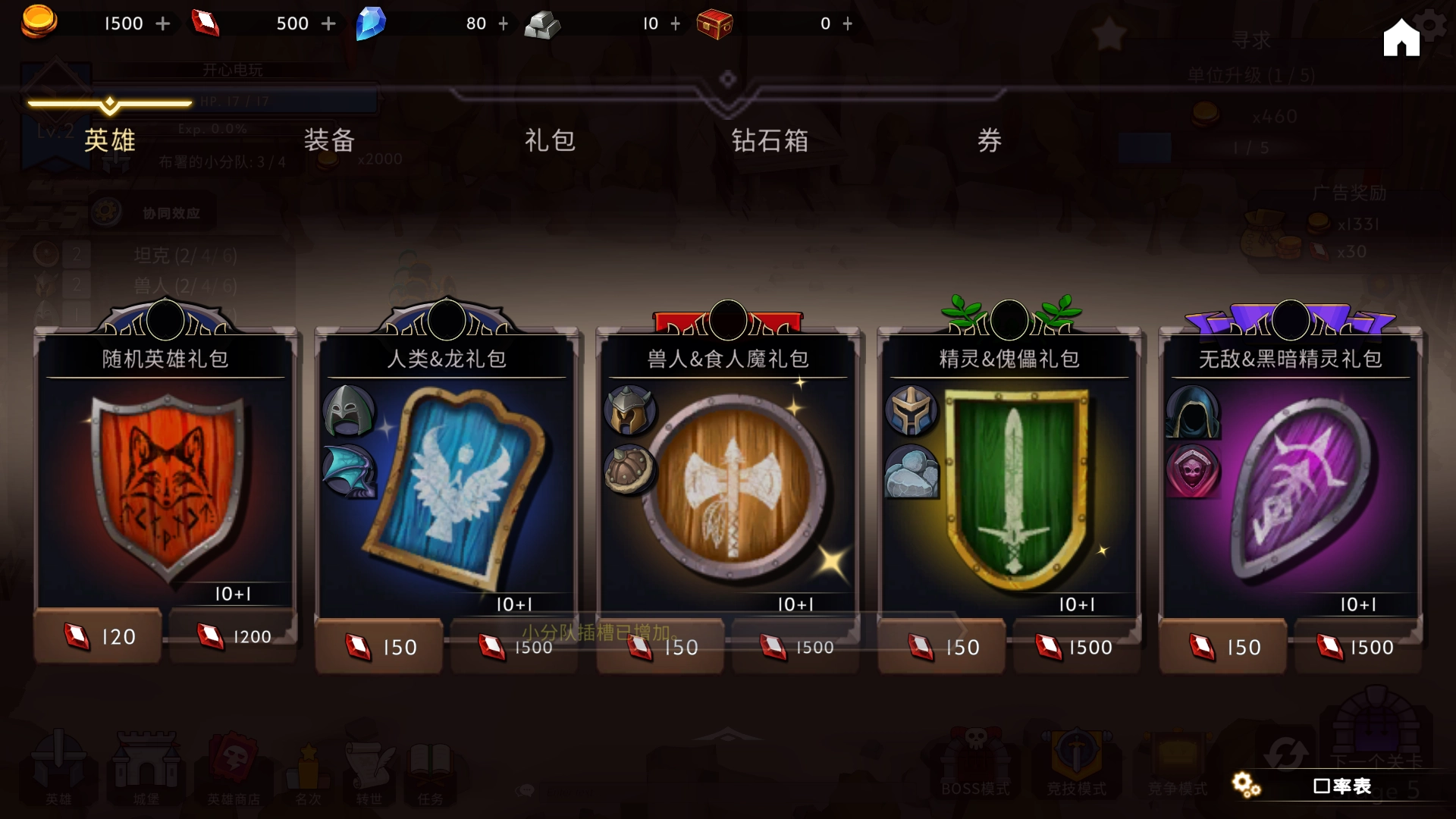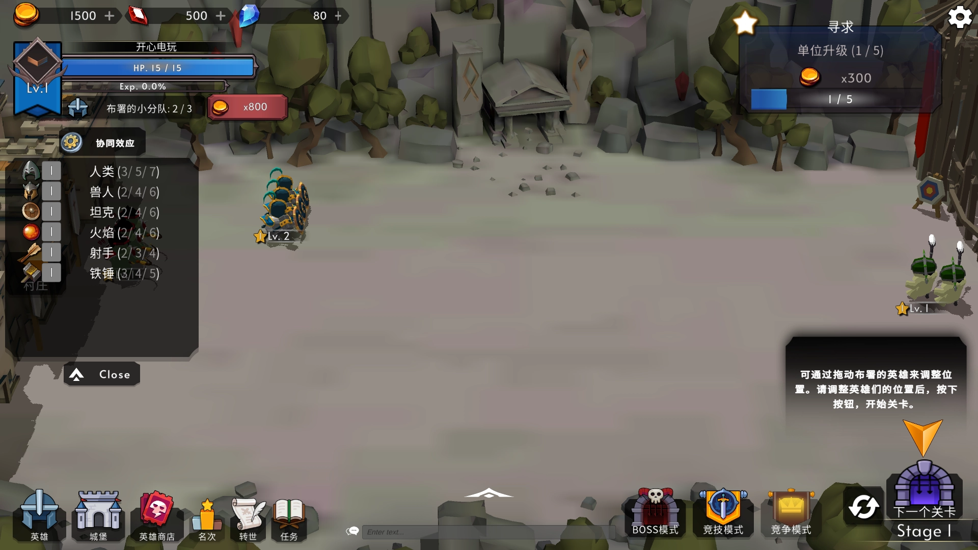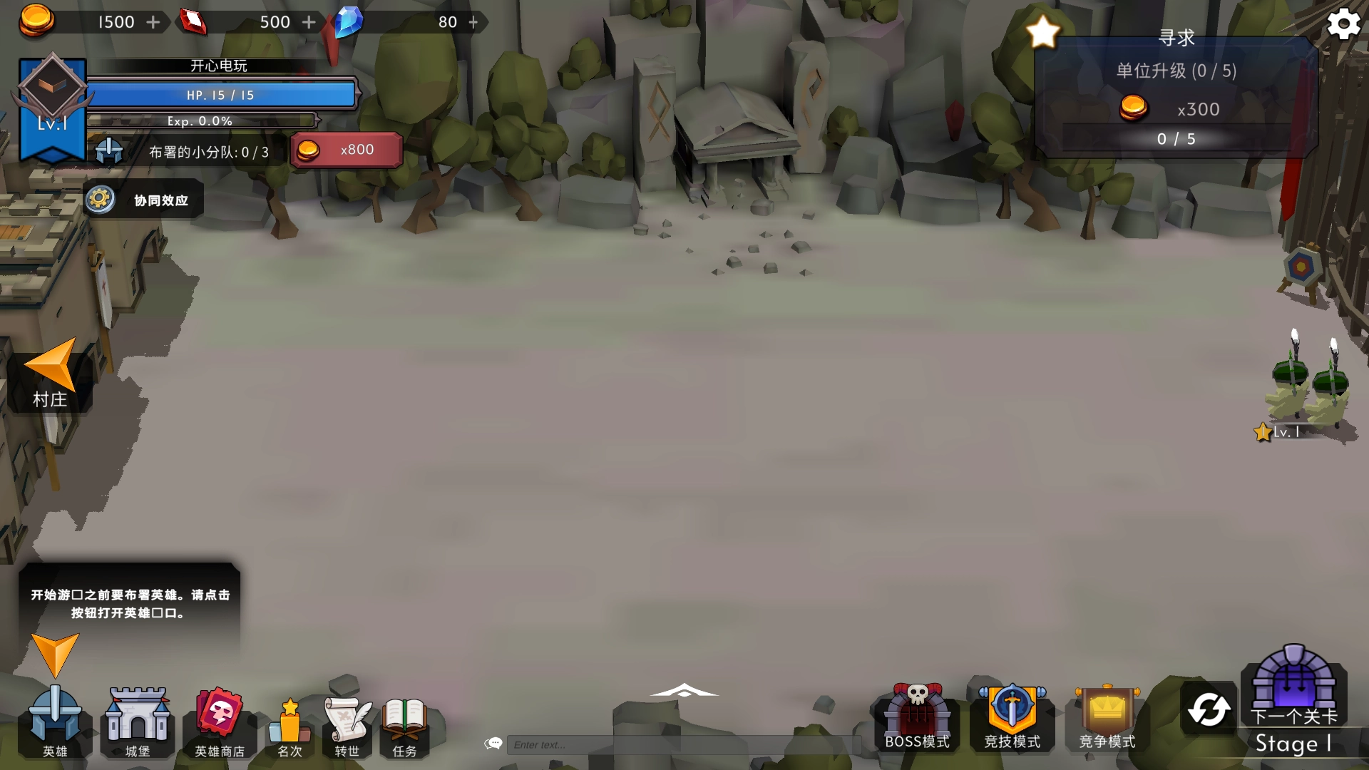 3、进入游戏点击左下角的英雄进行排兵布阵。