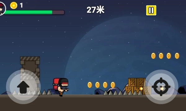 1、借助虚拟按键操控角色的移动与射击动作,在横向卷轴式的关卡里,清除沿途遭遇的各种敌人。