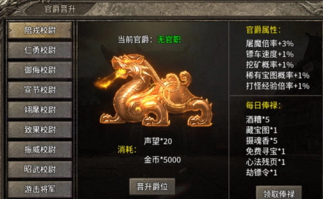 官爵晋升处晋升官爵每日可以领取大量福利。