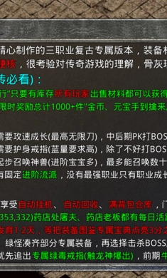 1、复古专属版本:游戏采用了复古的设计风格,带给玩家经典传奇的游戏体验。