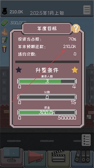 4、这是年度目标界面,需完成投资方占股、年末还款等目标,同时达成升星条件来运营制片厂。