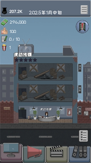3、进入游戏后看到剧情提示厂长,由于之前很长一段时间的经营不善,制片厂已经接近破产。了解背景后推进经营操作。