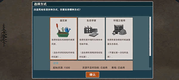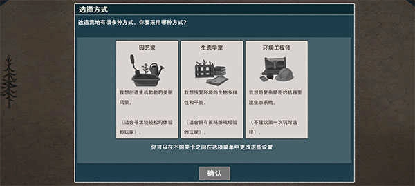 1、进入伊始之地游戏后,首先会播放一段动画,随后你可以从园艺家、生态学家和环境工程师这三种玩法模式中进行选择。