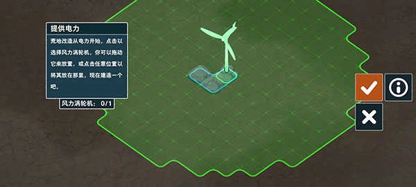 4、现在,我们开始建造,先放置一个风车,获得电力,拖动选择放置位置,红色的代表是不可选区域。