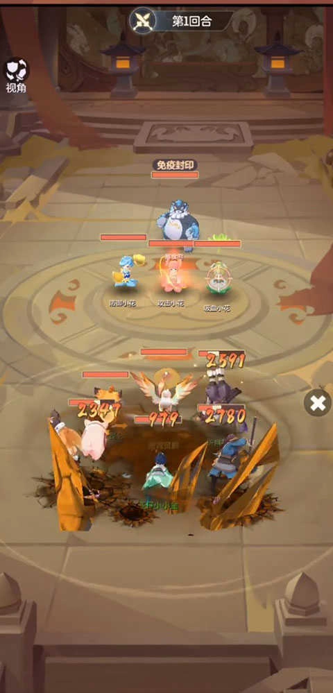 2、第2-3回合优先集中火力攻击小花,将其点杀成功后,就可以准备集火暴食熊。灵鹤被击倒后,带有闪现技能的灵狐会出场,由于灵狐速度较快,能够给我方其他单位喂药,以此维持我方单位的站场能力。