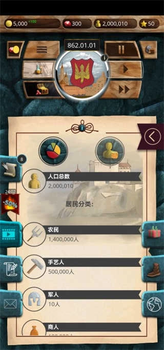 6、人口:在这里你能查看当前各单位的人口数量,还可以招募农民或其他经济单位。不过要注意,不要随意招募过多人口,否则可能会出现粮食短缺的情况,进而导致国民支持度(后续会详细说明)下降。