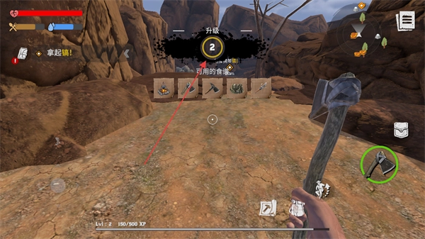 1、按提示拿起镐!,选择并装备镐子,准备进行资源采集。
