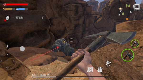 2、根据提示找石头,用镐子开采场景中的石头,获取石材资源。