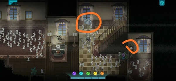 第一关的内容我再详细说明一下:一楼右侧有个钟,二楼能找到腌橄榄、书包、书和花。需要关联起来的物品是一楼右上方的那把伞。