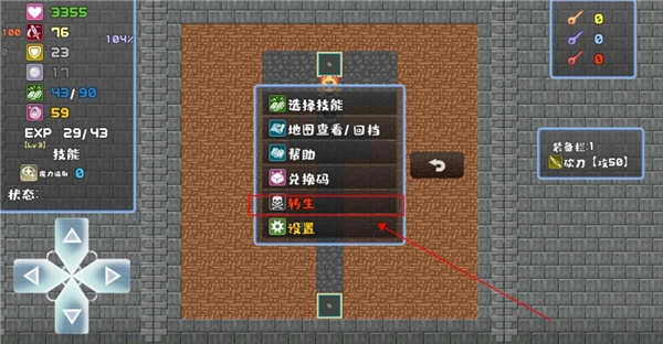 7、要是在探索过程中发现自己已经打不过任何敌人了,我们可以点击设置选择转生,以此结束当前的冒险,之后再用结算得到的灵魂来提升初始属性。