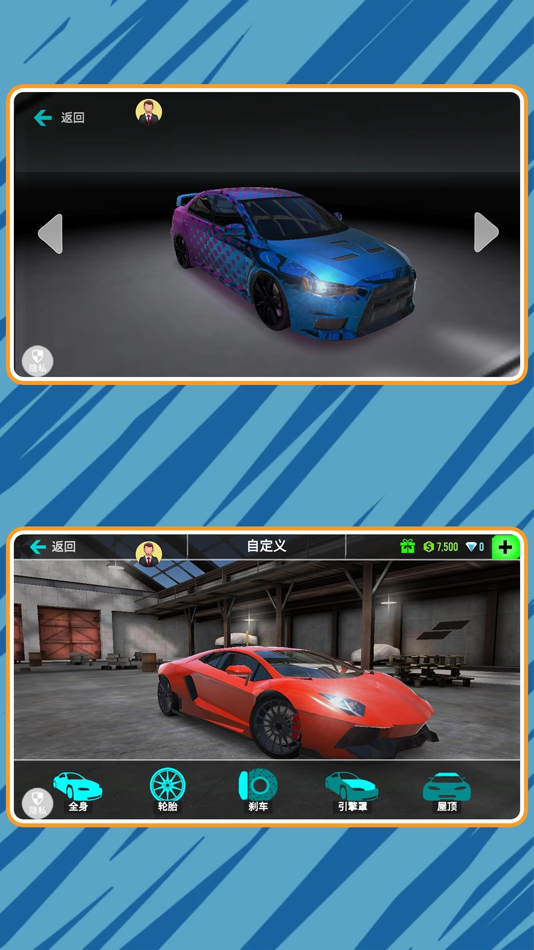 3、支持对引擎、轮胎、喷气装置等部件进行升级,以此提升赛车性能,同时还能自定义涂装和皮肤外观,打造出属于自己的专属座驾。
