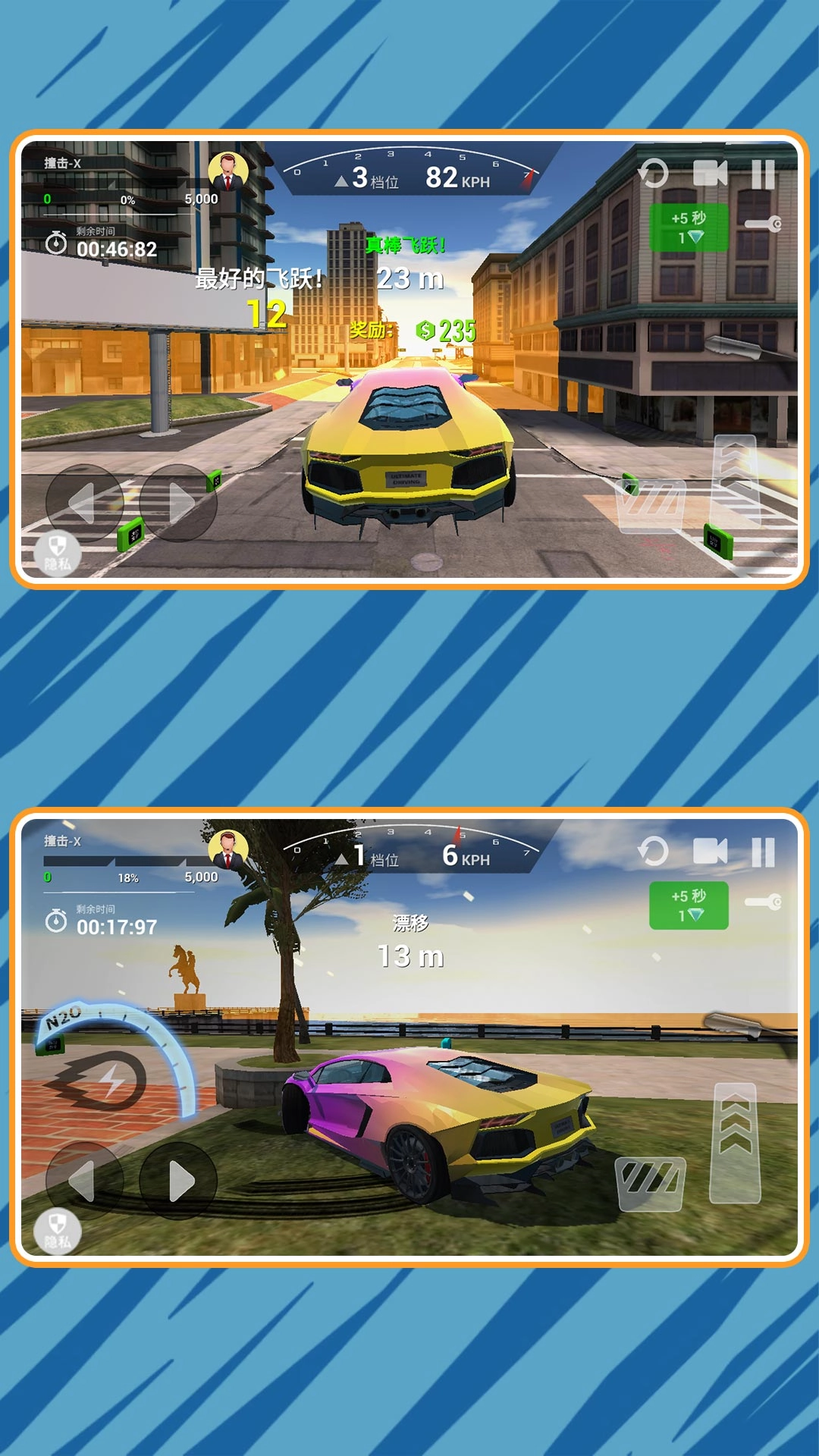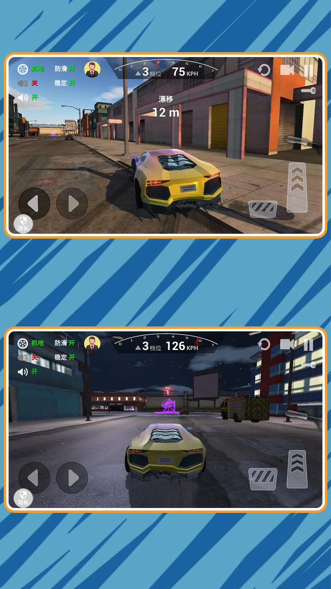 1、游戏采用即时竞速机制,玩家通过左侧方向盘控制车辆转向与漂移,右侧控制加速和后退。