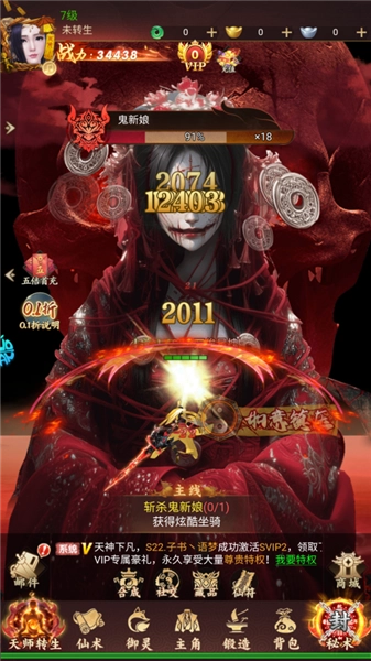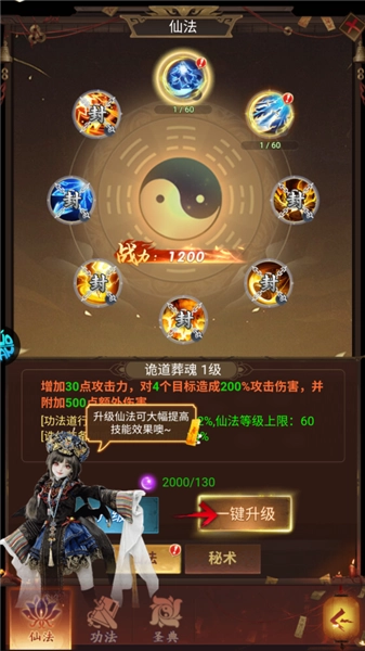 4、打怪途中不要忘记为自己提升哦!后面的怪物会越来越强大,点击仙法,一键升级。