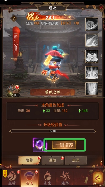 可以消耗道友培养丹来增加培养经验,当经验值累积满后,培养等级会自动提升,每次升级都能为主角和道友带来可观的属性加成。