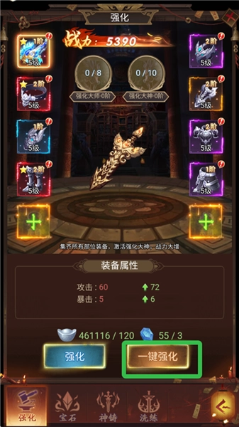 给装备做强化处理,能提升攻击、血量、抗暴这类属性;要是把各个部位的装备都凑齐了,还能解锁“强化大神”效果,让战力得到大幅增长。