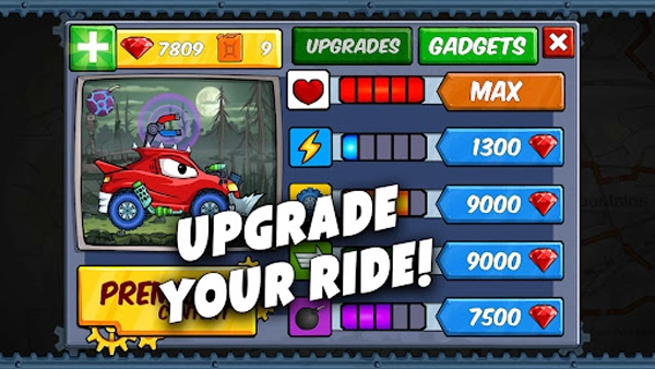 3、收集空中的【红宝石】可快速增加分数,借助【闪电】道具增强车辆能力,轻松应对挑战。