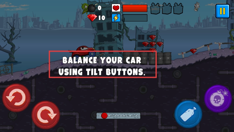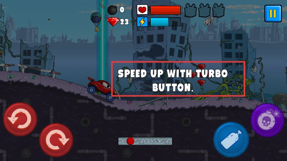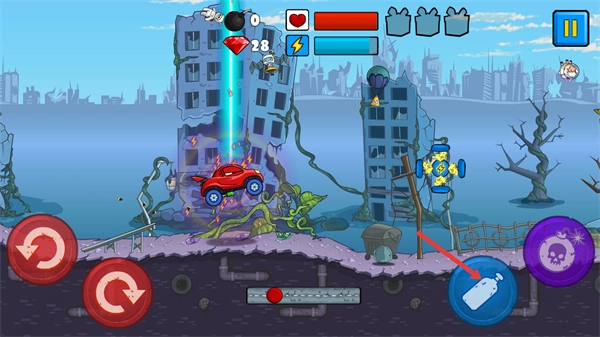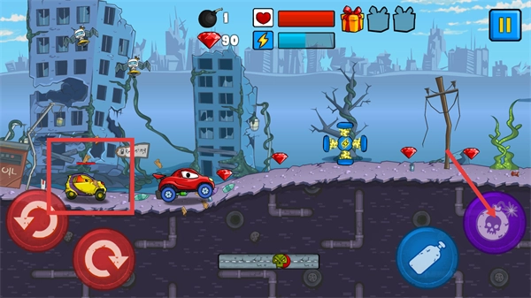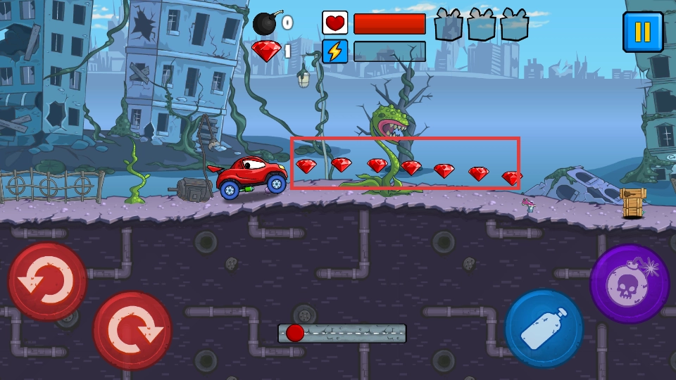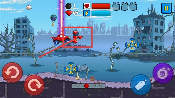 2、使用【蓝色瓶子】道具可使车辆跃起,借此躲避障碍并收集【红宝石】,通过积累分数来推进关卡进度。