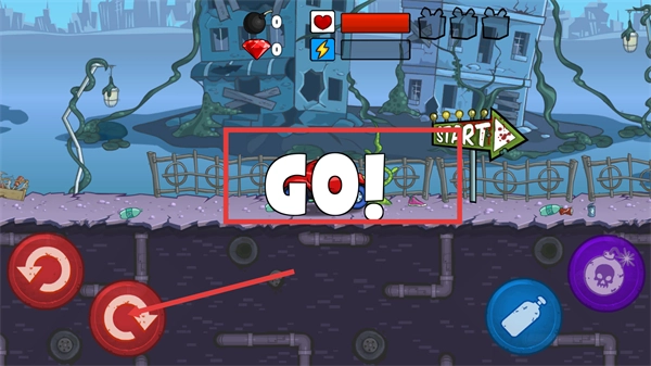 1、点击【GO】按钮启动游戏,左下角的按钮能操控车辆前进,还可以收集场景里的道具,为后续关卡的推进提供帮助。