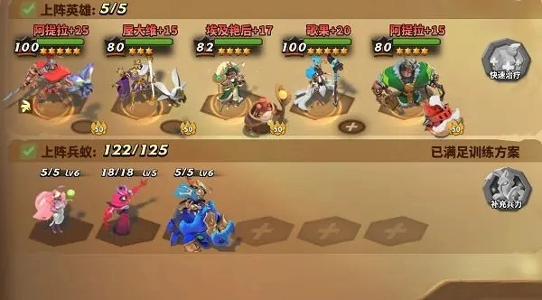 5、打世界地图的话可以选择治疗蚁+厚甲猛蚁(治疗蚁6-8个就合适)——世界地图是不损耗小兵的在蚁后宫殿升11本之前,都可以用这套兵种搭配,一般来说,5个治疗蚁、5个厚甲猛蚁,其余全弓骑蚁。