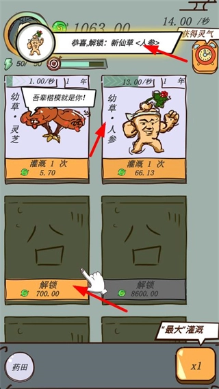 4、后续可以不断的解锁灵草类型和灌溉来持续获得灵草。