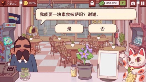 12、要是你已经解锁了蘑菇、橄榄、洋葱和青椒这几种配料,就选择“是”;要是配料没集齐,就选“否”。之后会给你50块钱。(所需配料为:酱料+芝士+蘑菇+橄榄+洋葱+青椒)另外补充说明一下,纯素食披萨的配料是酱料+蘑菇+橄榄+洋葱+青椒,相比素食披萨少了芝士这一项。