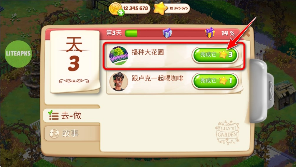 获得奖励后返回主页,点击左下角的“任务”选项,完成任务即可顺利推进花园的建设。