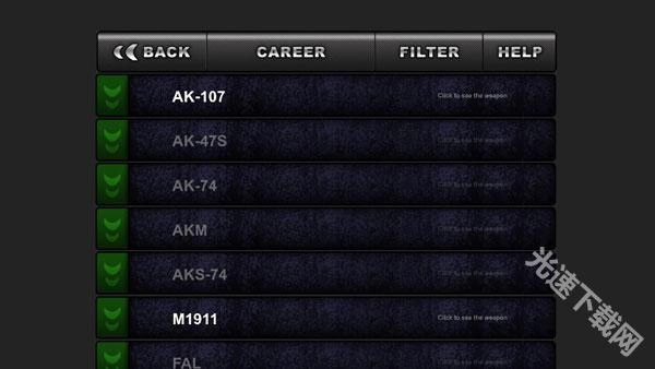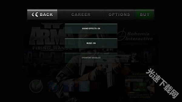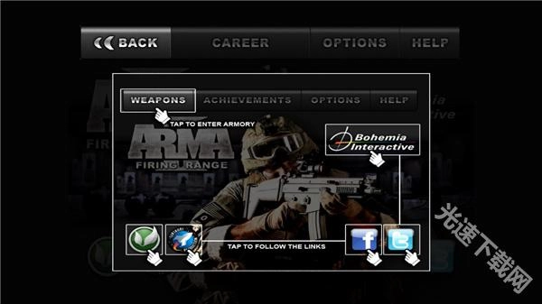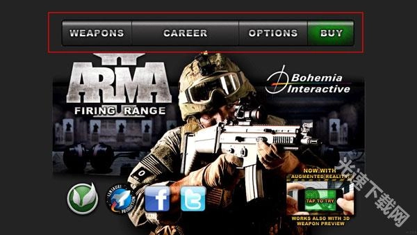 1、启动武装突袭2手机版,进入游戏主界面,该界面包含【WEAPONS】武器、【CAREER】职业、【OPTIONS】设置以及【BUY】购买等功能选项,随后选择【WEAPONS】选项。