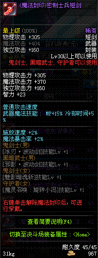 | 30 | (魔法封印)密制士兵短剑 | *Lv29~36普通地下城怪物掉落 *完成[再探英雄冢]任务 *使用Lv29~36怪物掉落的设计图进行制作 |