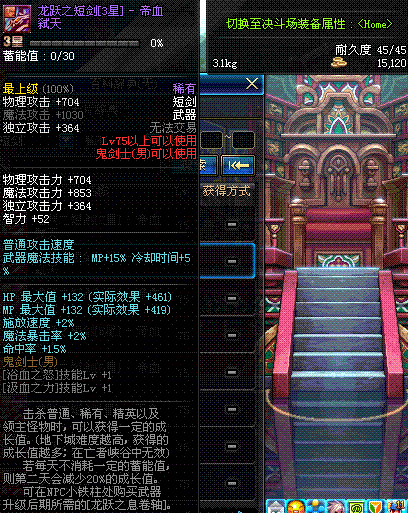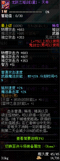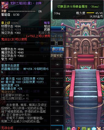 | 75 | 龙跃之短剑[1星] - 帝血弑天 | *完成二次觉醒任务后可以从NPC小铁柱处获得此道具。 | ||