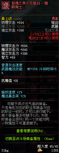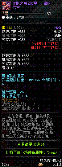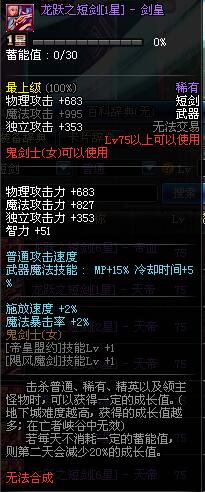 | 75 | 龙跃之短剑[1星] - 黑暗君主 | *完成二次觉醒任务后可以从NPC小铁柱处获得此道具。 | ||