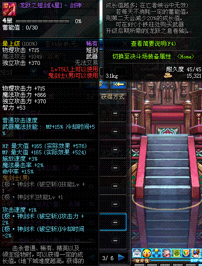 | 75 | 龙跃之短剑[3星] - 天帝 | *完成二次觉醒任务后可以从NPC小铁柱处获得此道具。 | ||
