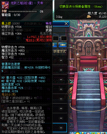 | 75 | 龙跃之短剑[1星] - 天帝 | *完成二次觉醒任务后可以从NPC小铁柱处获得此道具。 | ||