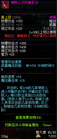| 30 | 蜘蛛公主的毒影剑 | *蜘蛛公主安吉丽娜 掉落(地下城:蜘蛛王国) *在NPC克伦特的物品店购买 (阿拉德陨石×105) |