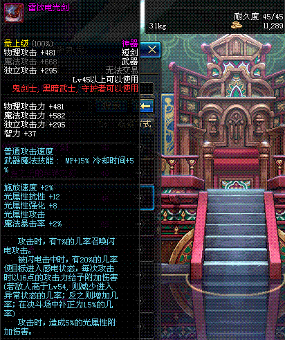 | 45 | 雷饮电光剑 | *落雷凯诺 掉落(地下城: 冰刺庭院) *在NPC敏泰的物品店购买 (阿拉德陨石×240) |