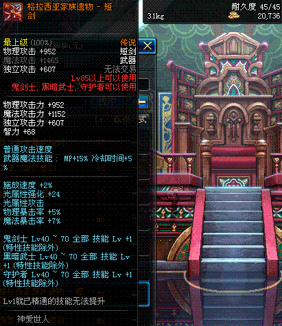 | 魔法石: | 全职业 鬼剑士 女鬼剑 女格斗 男格斗 男枪手 女枪手 魔法师 男法师 圣职者 暗夜使者 守护者 魔枪师 |