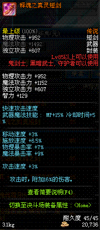| 85 | 镇魂之封灵短剑 | *时空之门地区 - 吟游诗人艾丽丝 出售 (镇魂之石×100) *购买镇魂武器礼盒(低级镇魂之石×140) |