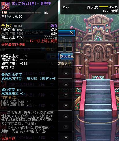 | 75 | 龙跃之短剑[2星] - 黑曜神 | *完成二次觉醒任务后可以从NPC小铁柱处获得此道具。 | ||