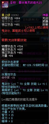| 70 | 圣物 : 暮冰精灵的追光剑 | *Lv70~76普通地下城怪物掉落 |
